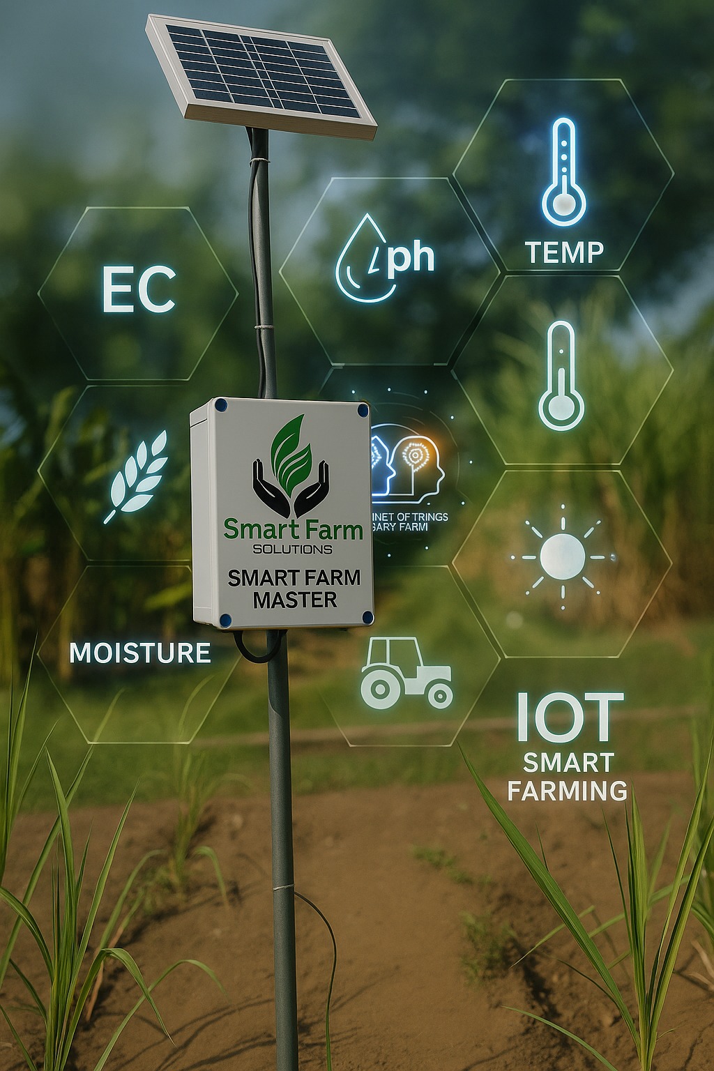 The Smart Farm Master is a solar-powered GSM + IOT-based central gateway that connects all devices in your field—Smart Pump, Smart Ferti, and Smart Valve units—into one intelligent ecosystem.